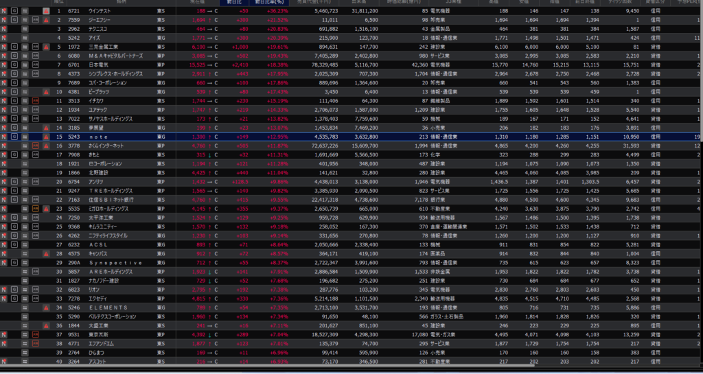 今日学んだ事があるとすれば、「新高値×売買代金多い」ってのは機関投資家とか個人のお金持ちが買ってるパターンが多い気がする。まぁ考えてみたら当たり前か(笑)