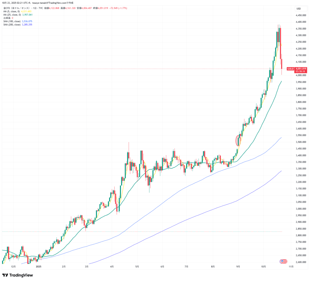 金相場が大幅下落 3000→4300まで上昇したので仕方ない部分はある。