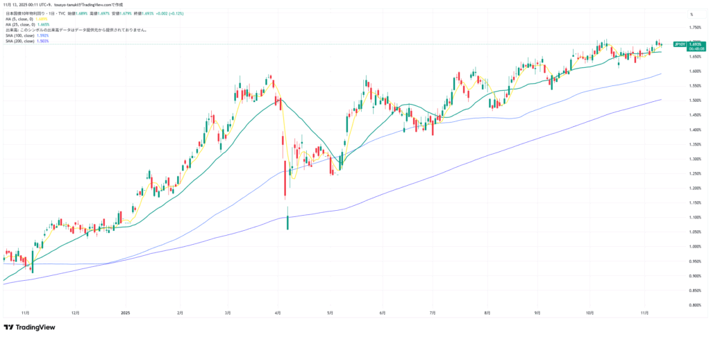 他にはTOPIXが高値更新。銀行と不動産株がとくに強い。銀行どこまで行くんだろう。利上げはもうしないと無理だな。