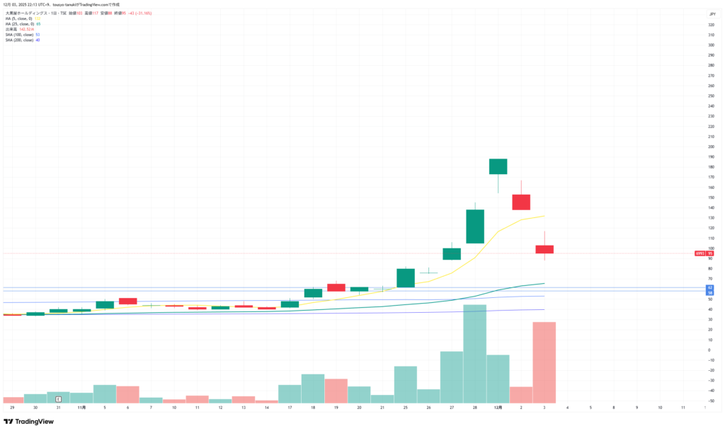 2日で半値まで下落。S高で最大の出来高。そしてリバウンド。上手いこと行けば高値更新まで持っていくはず。